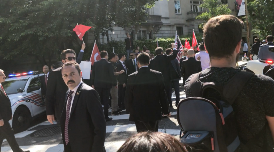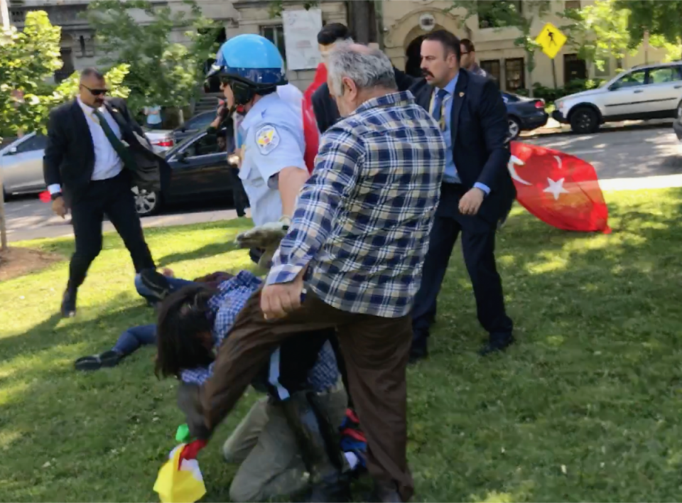 Τα επεισόδια ξεκίνησαν όταν οι μπράβοι του Ταγίπ Ερντογάν εξήλθαν της τουρκικής πρεσβείας και επιτέθηκαν εναντίον των διαδηλωτών, που διαμαρτύρονταν εναντίον του προέδρου της Τουρκίας και ειδικά για τα ανθρώπινα δικαιώματα των Κούρδων.
