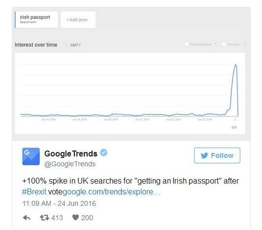 Ήδη, όπως επιβεβαίωσε το πρωί της Παρασκευής το Google στο Twitter, οι αναζητήσεις «πώς να βγάλω ιρλανδικό διαβατήριο» αυξήθηκαν κατακόρυφα λίγες ώρες μετά τα πρώτα αποτελέσματα.