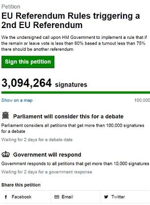 Η πιθανότητα δεύτερου δημοψηφίσματος δεν πρέπει να αποκλειστεί, δήλωσε σήμερα ο Βρετανός πρώην πρωθυπουργός Τόνι Μπλερ, την ίδια ώρα που οι διαδικτυακές αιτήσεις για επανάληψη του δημοψηφίσματος έχουν ξεπεράσει τα τρία εκατομμύρια.