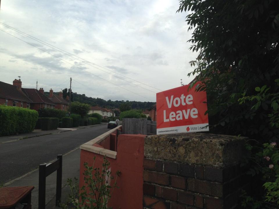 Σε μισογκρεμισμένο τοίχο μια αφίσα του Leave
