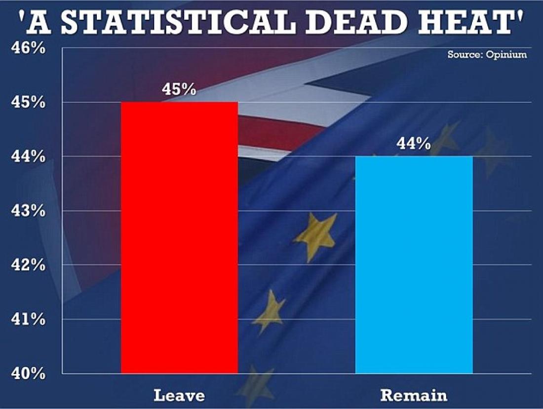 'Οπως προκύπτει από την δημοσκόπηση της εταιρίας Opinium το Brexit συγκεντρώνει 45% και 44% το Remain. Την Κυριακή δημοσκόπηση της ίδιας εταιρίας έδινε το ίδιο ποσοστό--44%--και στα δύο στρατόπεδα.