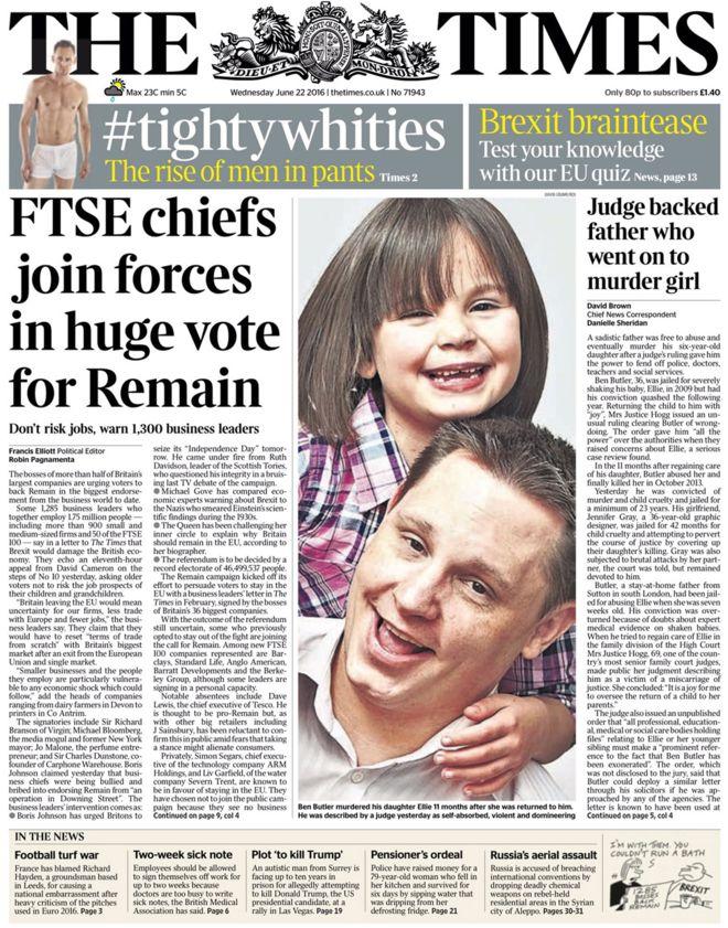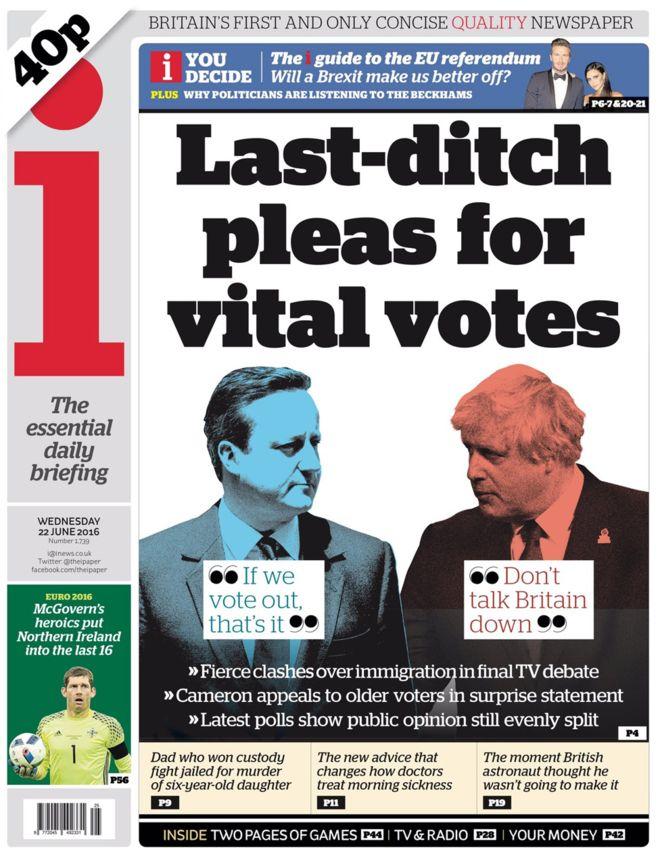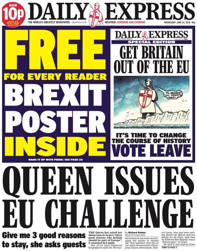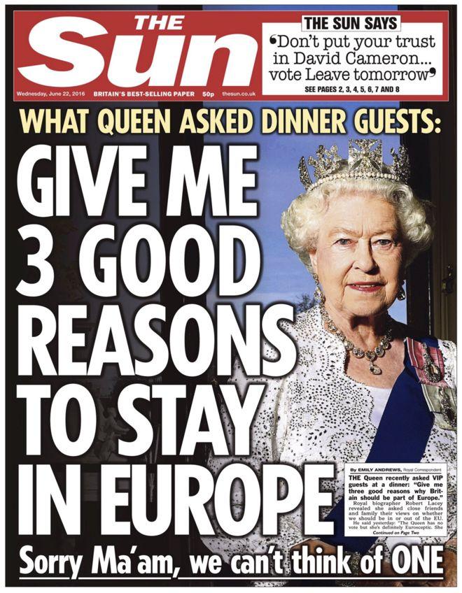 Σχεδόν όλες οι εφημερίδες σήμερα στην Βρετανία καταλήγουν στο ίδιο συμπέρασμα: ότι η μάχη θα είναι δύσκολη και η διαφορά που θα κρίνει το αποτέλεσμα πολύ μικρή. Και φυσικά γίνεται αναφορά στην βασίλισσα Ελισάβετ, αλλά και στην σύγκριση του ευρωσκεπτικιστή Μάικλ Γκοβ της εκστρατείας Remain με τους Ναζί!