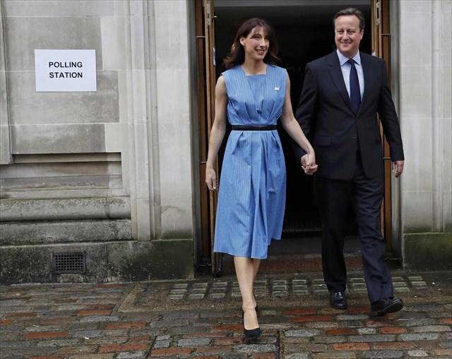 Ο Βρετανός πρωθυπουργός Ντέιβιντ Κάμερον και η σύζυγός του Σαμάνθα αποχωρούν από εκλογικό τμήμα, στο κέντρο του Λονδίνου.