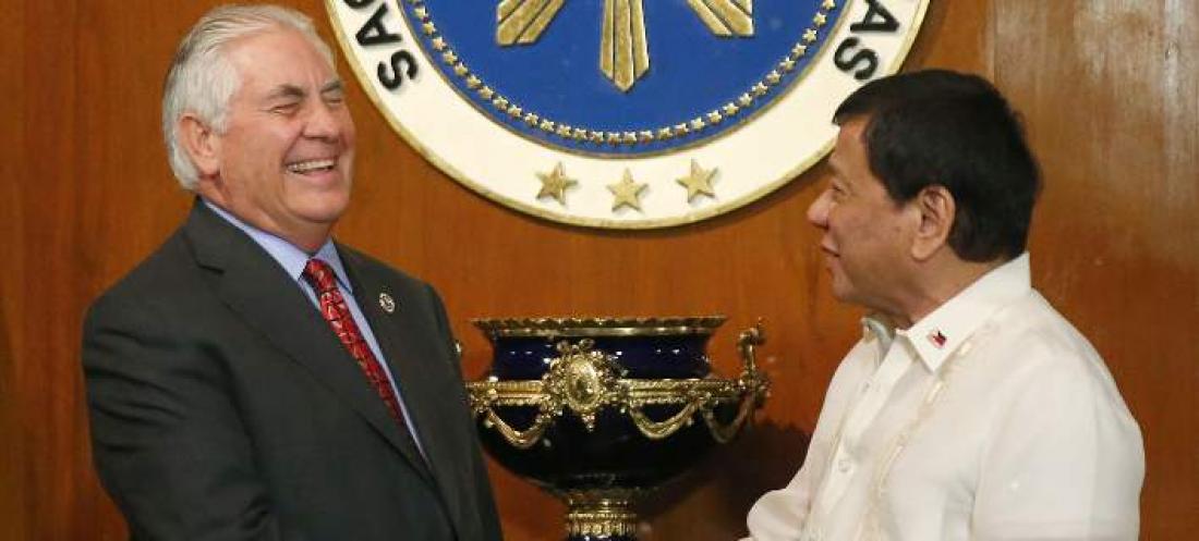 «Χαίρομαι που σας βλέπω και ήλθατε εδώ σε μια περίοδο όπου ο κόσμος δεν βρίσκεται σε τόσο καλή κατάσταση, ειδικά στην κορεατική χερσόνησο, και φυσικά με το πάντα βασανιστικό πρόβλημα της Νότιας Σινικής Θάλασσας» είπε ο Ντουτέρτε στον Τίλερσον που τον έκανε δεκτό στο προεδρικό μέγαρο.