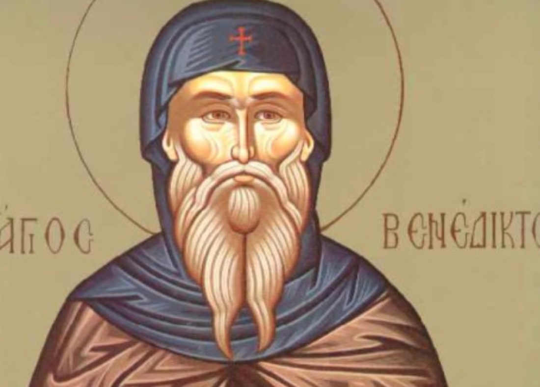 O όσιος Βενέδικτος, γεννήθηκε στη Νουρσία της Ιταλίας και έζησε τον 6ο αι. Οι γονείς του ευγενείς και πλούσιοι τον ανέθρεψαν με αγάπη, ταπεινό φρόνημα και βαθιά ευσέβεια. Μόλις ενηλικιώθηκε, εγκατέλειψε τα πατρικό σπίτι και αποσύρθηκε σ` ένα φαράγγι στο Απέννινα όρη, όπου επιδόθηκε με θαυμαστό ζήλο στην προσευχή, την άσκηση και τη μελέτη. Γρήγορα η ασκητική και αγία ζωή του, έγινε γνωστή και απέκτησε μεγάλη φήμη. Σε διάστημα λιγότερο των είκοσι ετών ήλθαν κοντά του 170 περίπου μοναχοί, με αποτέλεσμα το έτος 540 να ιδρύσει μοναστήρι επάνω στο Όρος Κασσίνο. O όσιος Βενέδικτος, είναι ο ιδρυτής του μοναχικού τάγματος των Βενεδικτίνων, το οποίο υφίσταται μέχρι και σήμερα στη Δυτική Εκκλησία. O όσιος, προαισθάνθηκε το τέλος του και έδωσε εντολή να ανοιχθεί τάφος για τον ενταφιασμό του. Μετά από ολιγοήμερη ασθένεια και αφού μετάλαβε των αχράντων μυστηρίων εκοιμήθη ειρηνικά το έτος 543 σε ηλικία 62 ετών.