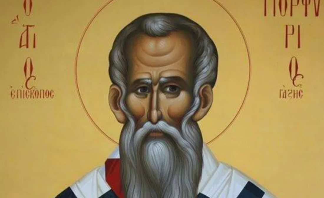 O άγιος Πορφύριος καταγόταν από τη Θεσσαλονίκη από πλούσια και αρχοντική οικογένεια. Μετά τις λαμπρές του θεολογικές και φιλοσοφικές σπουδές, αρνήθηκε την πλούσια και κοσμική ζωή και αποσύρθηκε αρχικά στα περίφημα μοναστήρια της Αιγύπτου και εν συνεχεία στα Ιεροσόλυμα, όπου χειροτονήθηκε ιερέας και τέλος επίσκοπος Γάζας. Από τη θέση αυτή αποδόθηκε στον αγώνα καταπολέμησης των αιρετικών. Για να προστατεύσει το ποίμνιό του, δεν δίστασε να μεταβεί στην Κωνσταντινούπολη και να ζητήσει την συνδρομή των αυτοκρατόρων Αρκαδίου και Ευδοξίας. Εκεί συνάντησε και τον άγιο Ιωάννη τον Χρυσόστομο, ο οποίος τον συνέστησε στους βασιλείς και στήριξε με θέρμη το αίτημα του. Παρά τις αρχικές του αντιδράσεις ο βασιλιάς επείσθη και χορήγησε στο Πορφύριο βασιλικό διάταγμα, με το οποίο περιόριζε την δράση των ειδωλολατρών και των λοιπών αιρετικών και με βασιλική χορηγία ανήγειρε εκκλησίες εκεί, όπου προηγουμένως βρισκόταν ειδωλολατρικοί ναοί. Μετά από εικοσιτέσσερα χρόνια επισκοπικών αγώνων εκοιμήθη ειρηνικά .