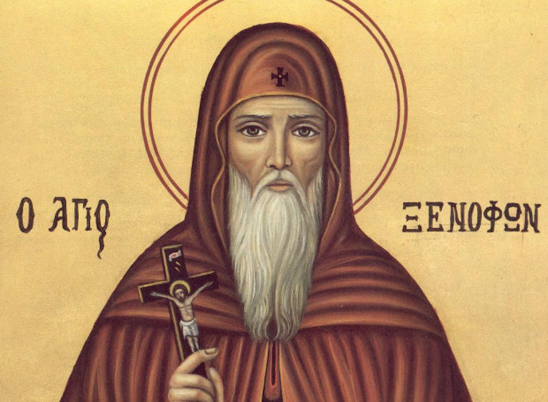 Όσιος Ξενοφών Ο Όσιος Ξενοφών κατοικούσε στην Κωνσταντινούπολη κατά τους χρόνους των αυτοκρατόρων Ιουστίνου Α’ (518 - 527 μ.Χ.) και Ιουστινιανού (527 - 565 μ.Χ.). Ήταν πλούσιος συγκλητικός και διακρινόταν για την βαθιά ευσέβειά του προς τον Θεό. Είχε δύο παιδιά, τον Αρκάδιο και τον Ιωάννη. Μόλις αυτά τελείωσαν τα εγκύκλια γράμματα, τα έστειλε στη Βηρυτό της Φοινίκης, για να μελετήσουν και να σπουδάσουν τη νομική επιστήμη. Καθ’ οδόν το πλοίο με το οποίο ταξίδευαν ναυάγησε. Διασώθηκαν όμως και μετέβησαν στα Ιεροσόλυμα όπου έγιναν μοναχοί. Οι γονείς τους, Ξενοφών και Μαρία, τους αναζήτησαν και πληροφορήθηκαν ότι διάγουν στην έρημο ασκητικό βίο, δόξασαν τον Θεό και αποταξάμενοι τον κόσμο, ακολούθησαν και αυτοί το μοναχικό βίο. Ο Ξενοφών, η γυναίκα του και τα παιδιά τους πρόκοψαν τόσο πολύ στην αρετή και στη φιλανθρωπία, ώστε τους αξίωσε ο Θεός , σύμφωνα με την παράδποση,να επιτελούν και θαύματα και κοιμήθηκε με ειρήνη.