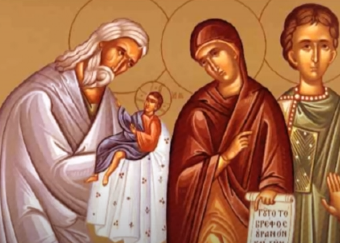 Ο Συμεών σαράντα ημέρες μετά την Γέννηση του Χριστού, πήγε στο Ναό του Σολομώντα και μόλις είδε τους γονείς να εισαγάγουν το παιδί Ιησού στο Ναό, το υποδέχτηκε στην αγκαλιά του αναφωνώντας: «Νυν απολύεις τον δούλον σου, Δέσποτα...».