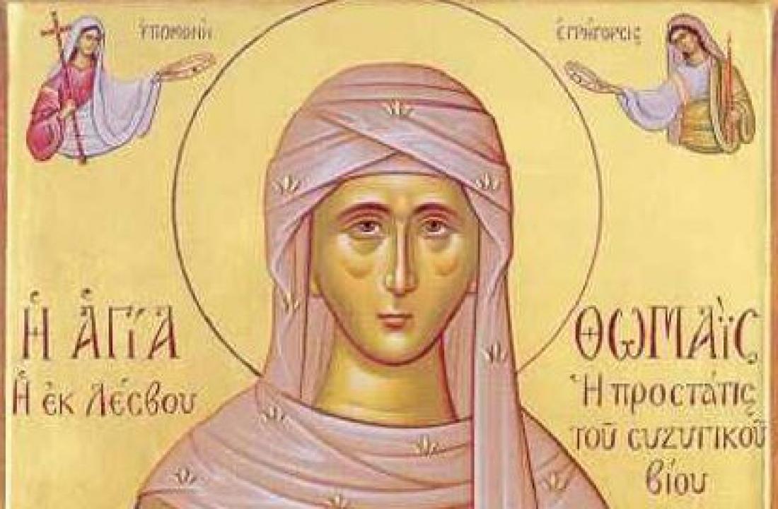Σύμφωνα με την έρευνα του κ. Φουντούλη (1927-2007) η Αγία Θωμαΐς γεννήθηκε στη Λέσβο μεταξύ των ετών 910 - 913. Παντρεύτηκε σε ηλικία 24 χρόνων αλλά ο συζυγός της ήταν ιδιαίτερα σκληρός μαζί της. Μετά το θάνατο του πατέρα της, η μητέρα της πήγε στο μοναστήρι, το γνωστό με το όνομα «τὰ Μικρὰ Ρωμαίου», έγινε μοναχή και αργότερα έγινε και ηγουμένη.