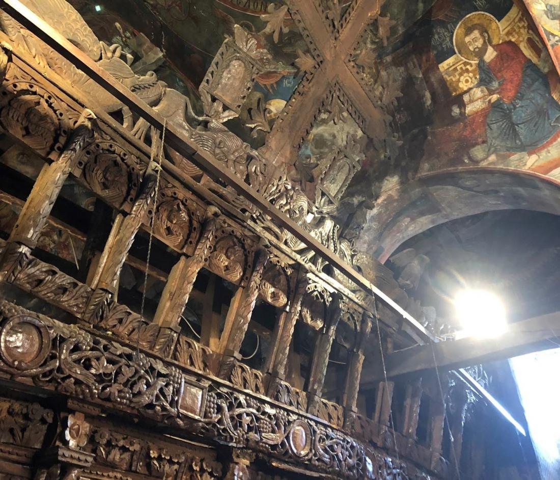 "Στο κεντρικό κλίτος, που χωρίζεται από τα πλάγια με τέσσερις κολώνες (2 σε κάθε πλευρά) υπάρχουν τρείς εσωτερικοί τρούλοι, ενώ στα πλάγια κλίτη απο τρείς καμάρες. Ολόκληρος ο κυρίως ναός, και το ιερό βήμα είναι κατάγραφο απο αγιογραφίες της ίδιας περιόδου. Ιδιαίτερο ενδιφέρον παρουσιάζει το ξυλόγλυπτο τέμπλο του ναού με αρκετές σκαλιστές παραστάσεις απο την Αγία Γραφή.