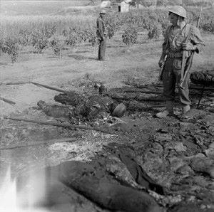 Νεοζηλανδός στρατιώης κοιτάζει το καμένο πτώμα του Γερμανού αλεξιπτωτιστή, ο οποίος σκοτώθηκε σε μάχες κοντά στο 7ο (British) Γενικό Νοσοκομείο, δυτικά των Χανίων.