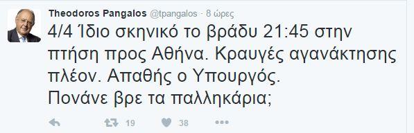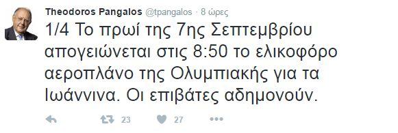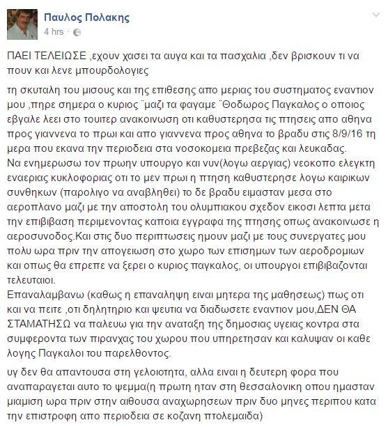 Αφορμή στάθηκαν οι αναρτήσεις που έκανε στο twitter o κ. Πάγκαλος στις οποίες ανέφερε ότι στο ταξίδι του κ. Πολάκη στα Γιάννενα στις 7 Σεπτεμβρίου, ο αναπληρωτής υπουργός καθυστέρησε τις αναχωρήσεις των πτήσεων τόσο από την Αθήνα προς τα Γιάννενα όσο και από τα Γιάννενα προς την Αθήνα.