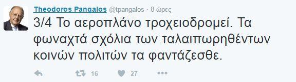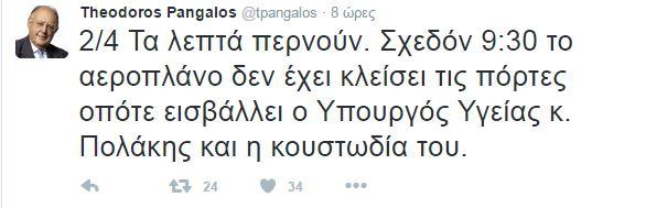 Τις συνεχείς επιθέσεις του Παύλου Πολάκη σε δημοσιογράφους σχολίασε ο πρώην υπουργός του ΠΑΣΟΚ Θεόδωρος Πάγκαλος σε ραδιοφωνική του συνέντευξη ενώ σε αναρτήσεις του στο twitter διηγήθηκε τη συνήθεια του αναπληρωτή υπουργού Υγείας να καθυστερεί τις πτήσεις.