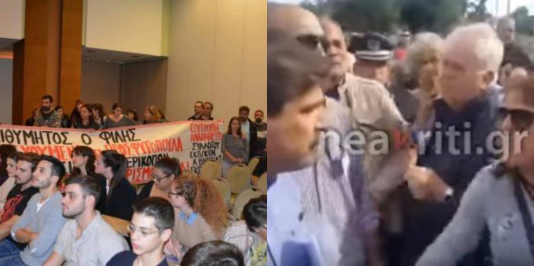 Νωρίτερα, έξω από το ξενοδοχείο εκπρόσωποι της ΕΛΜΕ Χανίων και φοιτητών του Πολυτεχνείου Κρήτης είχαν συγκεντρωθεί με πανό για να διαμαρτυρηθούν στον Υπουργό Παιδείας για το αδιέξοδο που έχει επέλθει στην παιδεία και να απαιτήσουν λύσεις.