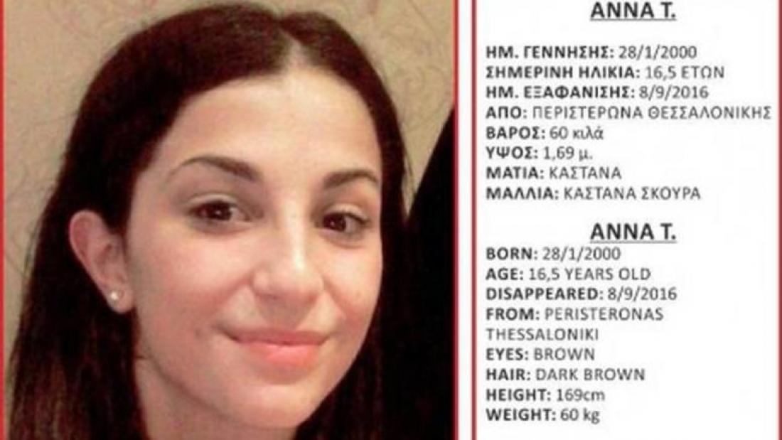 Αίσιο τέλος είχε η εξαφάνιση της 16χρονης Άννας Τερζίδου από την Θεσσαλονίκη η οποία είχε εξαφανιστεί από τις αρχές Σεπτεμβρίου. Σύμφωνα με πληροφορίες το ανήλικο κορίτσι παρουσιάστηκε το μεσημέρι του Σαββάτου μόνη της στο Τμήμα Ασφάλειας Ηλιούπολης και είναι καλά στην υγεία της.