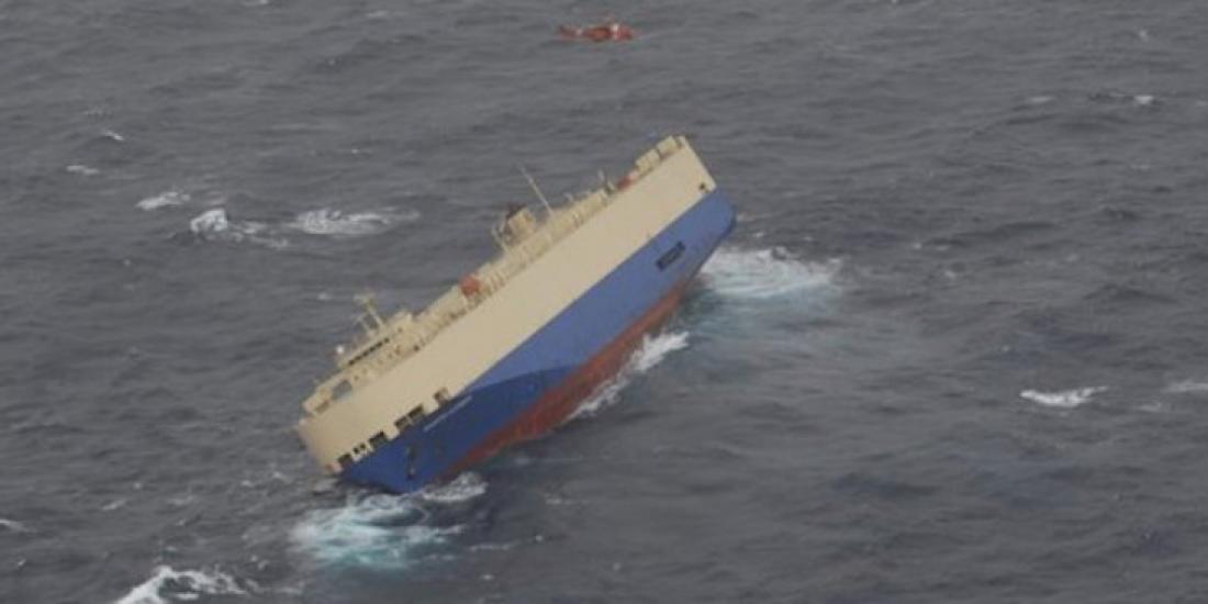 Το πλοίο παρουσιάζει κλίση, λόγω μετατόπισης φορτίου, ενώ το πλήρωμα έχει αιτηθεί την εγκατάλειψή του.