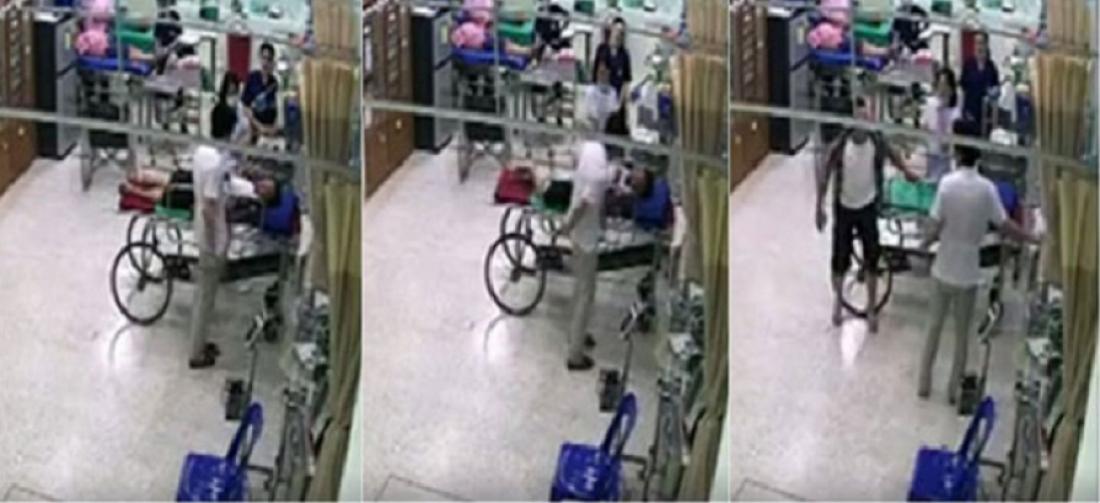 Στην προσπάθεια των γιατρών και νοσηλευτών να τον εξετάσουν, επετέθη βίαια εκσφενδονίζοντας προς αυτούς διάφορα αντικείμενα που υπήρχαν στον χώρο, όπως οι μεταλλικές βάσεις στήριξης ορού. Από την επίθεση τραυματίστηκε νευρολόγος τον οποίο επιχείρησε να χτυπήσει στο κεφάλι, ευτυχώς ελαφρά καθώς πρόλαβε να αποκρούσει το αντικείμενο της επίθεσης και μία γιατρός την οποία δάγκωσε.