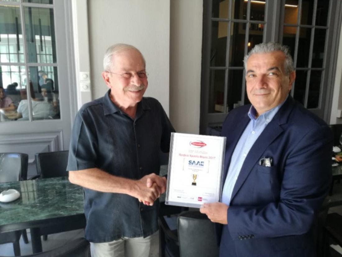 Κατά την αποχώρηση του, ο Γιώργος Αντώναρος παρέδωσε στον νέο πρόεδρο, Ντίνο Φραντζεσκάκη,το βραβείο FamousBrand 2018 που έλαβε πρόσφατα ο ΣΑΑΕ ως εκπρόσωπος του κλάδου για την πολύτιμη συνεισφορά του στην Ελληνική οικονομία.