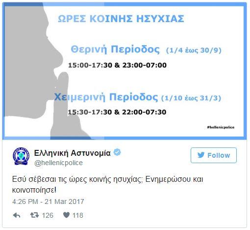 Η Ελληνική Αστυνομία «τιτίβισε» στο twitter και μας ρωτάει αν σεβόμαστε τις ώρες κοινής ησυχίας και μας ενημερώνει για το νέο ωράριο.