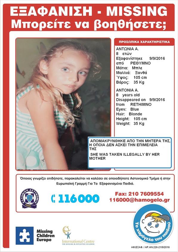 «Στις 9 Σεπτεμβρίου 2016 και ώρα 12.00, απομακρύνθηκε η Αντωνία Α., 8 ετών από τη μητέρα της, η οποία δεν ασκεί την επιμέλειά της, από την περιοχή Ρουσσοσπίτι Ρεθύμνου. Η Αντωνία Α., έχει ύψος 1,05 μ., ζυγίζει 35 κιλά, έχει ξανθά μαλλιά και μπλε μάτια. Ιδιαίτεροι λόγοι καθιστούν απαραίτητη την άμεση εύρεση της, καθώς η παραμονή της μακριά από το άτομο που ασκεί την επιμέλειά της θέτει σε κίνδυνο την ανήλικη.