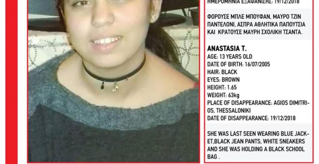 Ανησυχία στην Θεσσαλονίκη από την εξαφάνιση της Αναστασίας Τ. 13 ετών από την περιοχή του Αγίου Δημητρίου.