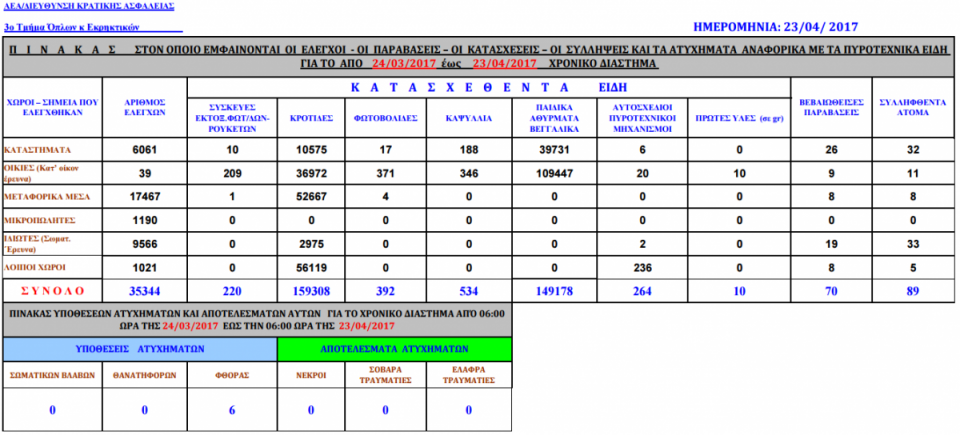 Κατά τη διενέργεια των ελέγχων συνολικά κατασχέθηκαν 310.000 πυροτεχνικά είδη περίπου. Σημειώνεται ότι, φέτος κατά την περίοδο των εορτών του Πάσχα, δεν αναφέρθηκαν στις Υπηρεσίες της Ελληνικής Αστυνομίας, τραυματισμοί ή θάνατοι από χρήση κροτίδων, βεγγαλικών και παιδικών αθυρμάτων.