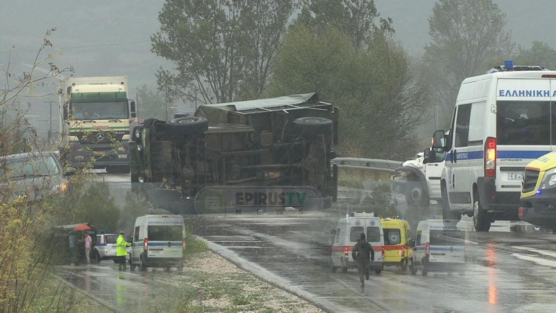 Στρατιωτικό όχημα ανετράπη και τραυματίστηκαν ελαφρά οι δύο επιβαίνοντας σε αυτό, μετά την εμπλοκή του σε τροχαίο με ένα φορτηγό και ένα ΙΧ αυτοκίνητο, στο 12ο χιλιόμετρο της εθνικής οδού Ιωαννίνων-Κοζάνης.