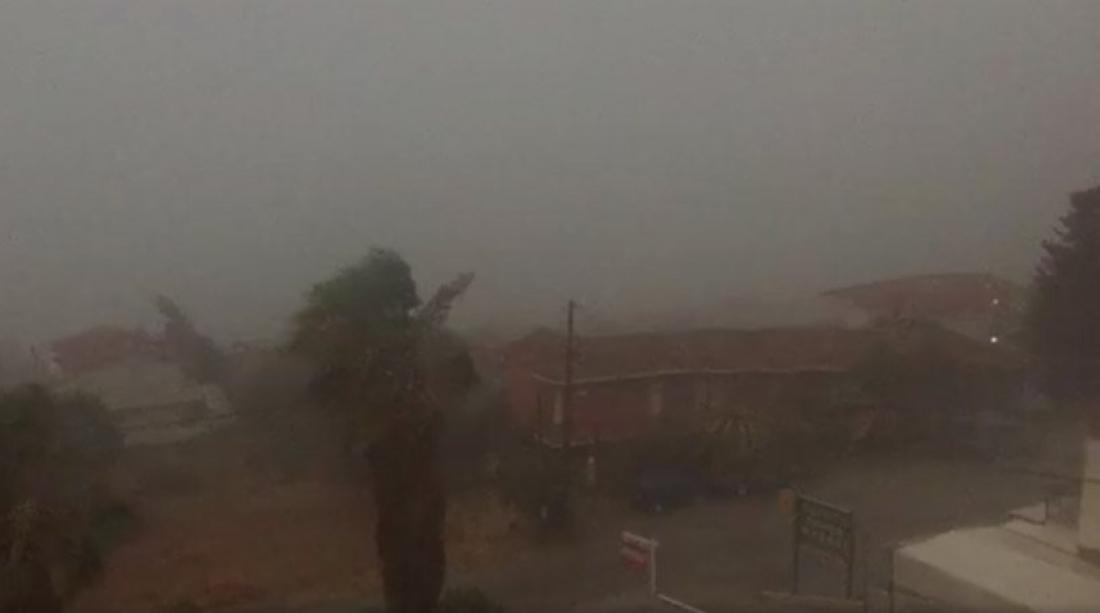 Αέρας να λυσομανάει, φοίνικες και δέντρα να βολοδέρνουν από τους ισχυρούς ανέμους, θολό ουρανό από την καταιγίδα, είχαμε σήμερα στην περιοχή Βλαχάτα στην Κεφαλλονιά.