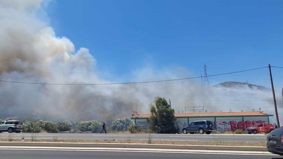 Η πυρκαγιά που ξέσπασε νωρίτερα, έχει δυο μέτωπα, προς Σαρωνίδα και προς Λαγονήσι, ενώ πνέουν άνεμοι εντάσεως 6 και 7 μποφόρ.