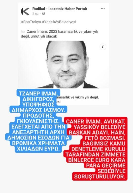 Νωρίτερα ο Δήμαρχος Ιάσμου, Οντέρ Μουμίν, κατηγορησε τον υποψήφιο για τον Δήμο Ιάσμου, Τζανέρ Ιμάμ, ότι είναι προδότης, στέλεχος της τρομοκρατικής οργάνωσης FETO και ότι ελέγχεται από την ΑΑΔΕ για ξέπλυμα μαύρου χρήματος!!!