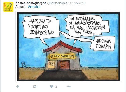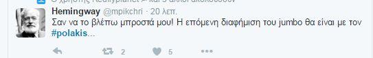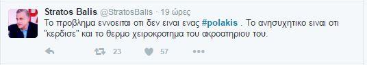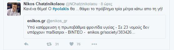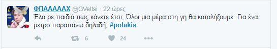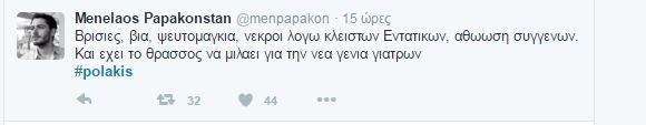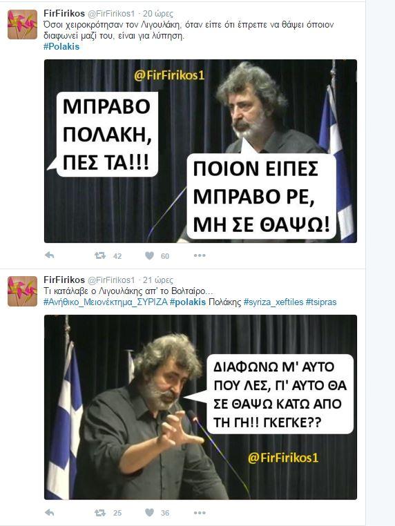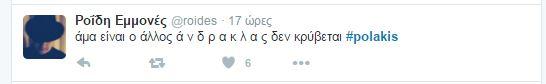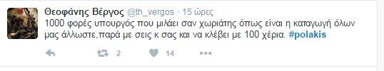 Συνεχίζονται οι αντιδράσεις στο twitter και στο διαδίκτυο γενικότερα οι αντιδράσεις για τον «αγροίκο» από τα Σφακιά, όπως τον αποκαλούν, εξαιτίας των απίστευτων ύβρεων και απειλών . Και σήμερα δημοφιλές hashtag, δηλαδή αυτό πυο συγκεντρώνει το ενδιαφέρον των περισσότερων χρηστών, το #polakis.