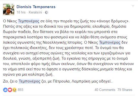 Η απόφαση του ΣΥΡΙΖΑ να βαφτίσει την σήραγγα «Νίκος Τεμπονέρας» προκάλεσε την αντίδραση του γιού του αδικοχαμένου καθηγητή το 1991, Διονύση Τεμπονέρα όπου με ένα post στη σελίδα κοινωνικής δικτύωσης , σχολίασε:«Ο Νίκος Τεμπονέρας σε όλη την πορεία της ζωής του 'άνοιγε δρόμους'. Πιστός στις αξίες και τα ιδανικά του για δημοκρατία, ελευθερία, δημόσια δωρεάν παιδεία, δεν δίστασε να βάλει το κεφάλι του μπροστά στα παρακρατικά λοστάρια του φασισμού και να λάβει θέση ανάμεσα στους λαϊκούς αγωνιστές της Νεοελληνικής Ιστορίας. Ο Νίκος Τεμπονέρας δεν έχει πολιτικούς ιδιοκτήτες, δεν τους χρειάστηκε ποτέ. Το όνομά του θα συνεχίσει να αντηχεί στους αγώνες της νεολαίας και των εργαζομένων για δουλειά, γνώση, αξιοπρεπή ζωή. Τα εγκαίνια της σήραγγας με το όνομά του, αποτελούν φόρο τιμής όλων εκείνων, όσων θα συνεχίσουν να πιάνουν το νήμα από εκεί που το άφησε ο αγωνιστής δάσκαλος, μνημείο πάλης και αγώνα για μια καλύτερη ζωή. Ζει, ζει ο Τεμπονέρας ζει, με Πέτρουλα, Λαμπράκη μάς οδηγεί».