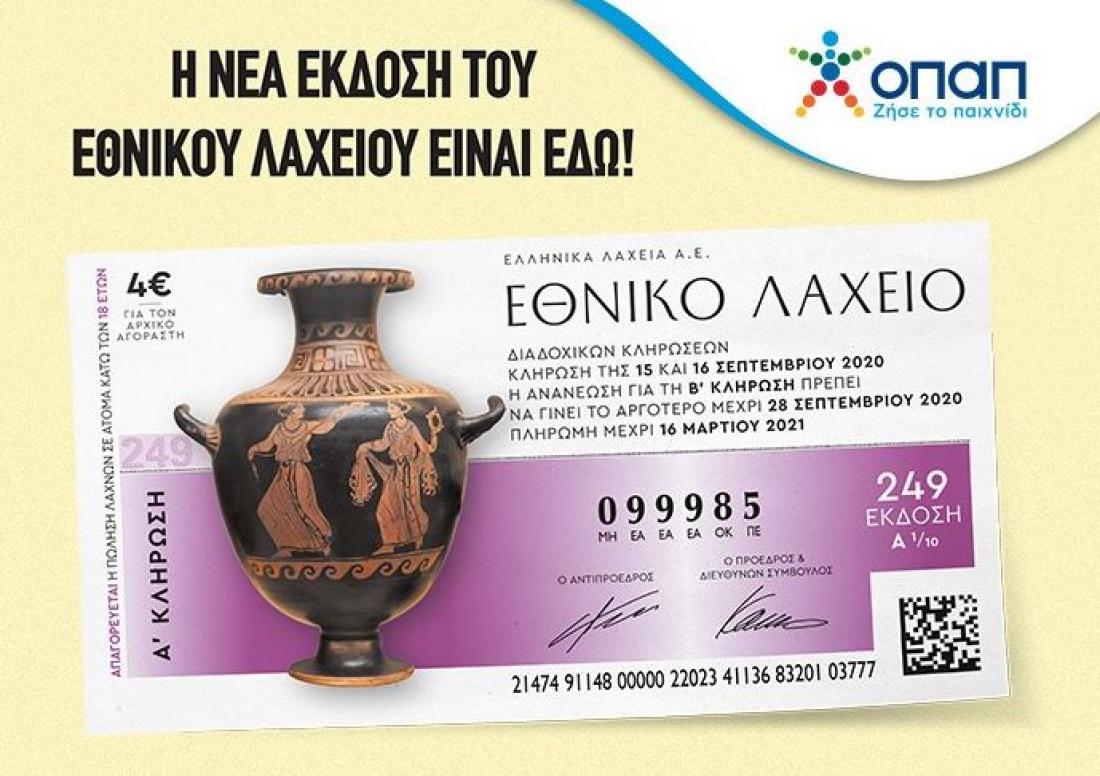 Η πρώτη κλήρωση της 249ης έκδοσης του Εθνικού Λαχείου θα πραγματοποιηθεί την Τρίτη, 15 Σεπτεμβρίου, και η τελευταία τη Δευτέρα, 2 Νοεμβρίου.