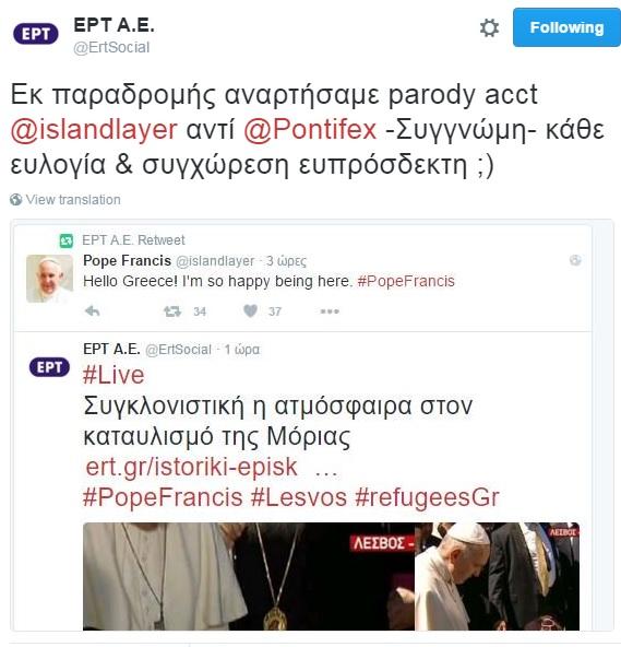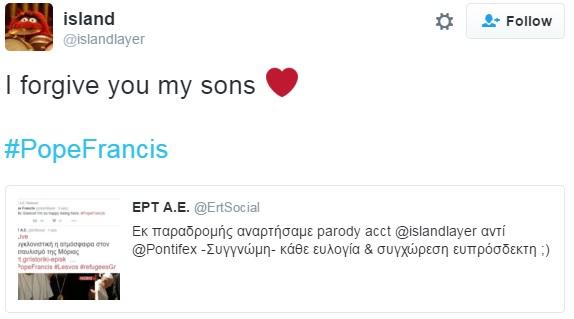 «Εκ παραδρομής αναρτήσαμε parody acct @islandlayer αντί @Pontifex -Συγγνώμη- κάθε ευλογία & συγχώρεση ευπρόσδεκτη ;)» ανέφερε το tweet της ΕΡΤ.