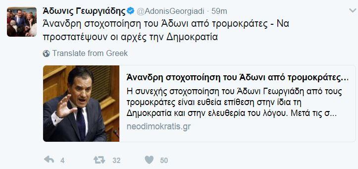 Συνεργάτες του κ. Γεωργιάδη είπαν στον ΑΝΤ1 ότι «πρόκειται για το 2ο χτύπημα εναντίον του μέσα σε 24 ώρες, που προέρχεται από τρομοκράτες εντός της χώρας. Στόχος τους είναι να φιμώσουν τον Άδωνι Γεωργιάδη. Δεν θα τα καταφέρουν!» Με ανάρτηση του στο Twitter, o Άδωνις Γεωργιάδης επίσης επιβεβαίωσε το γεγονός της αναγραφής των στοιχείων του στο πακέτο -βόμβα και έκανε λόγο για "συνεχή στοχοποίηση του απο τρομοκράτες".
