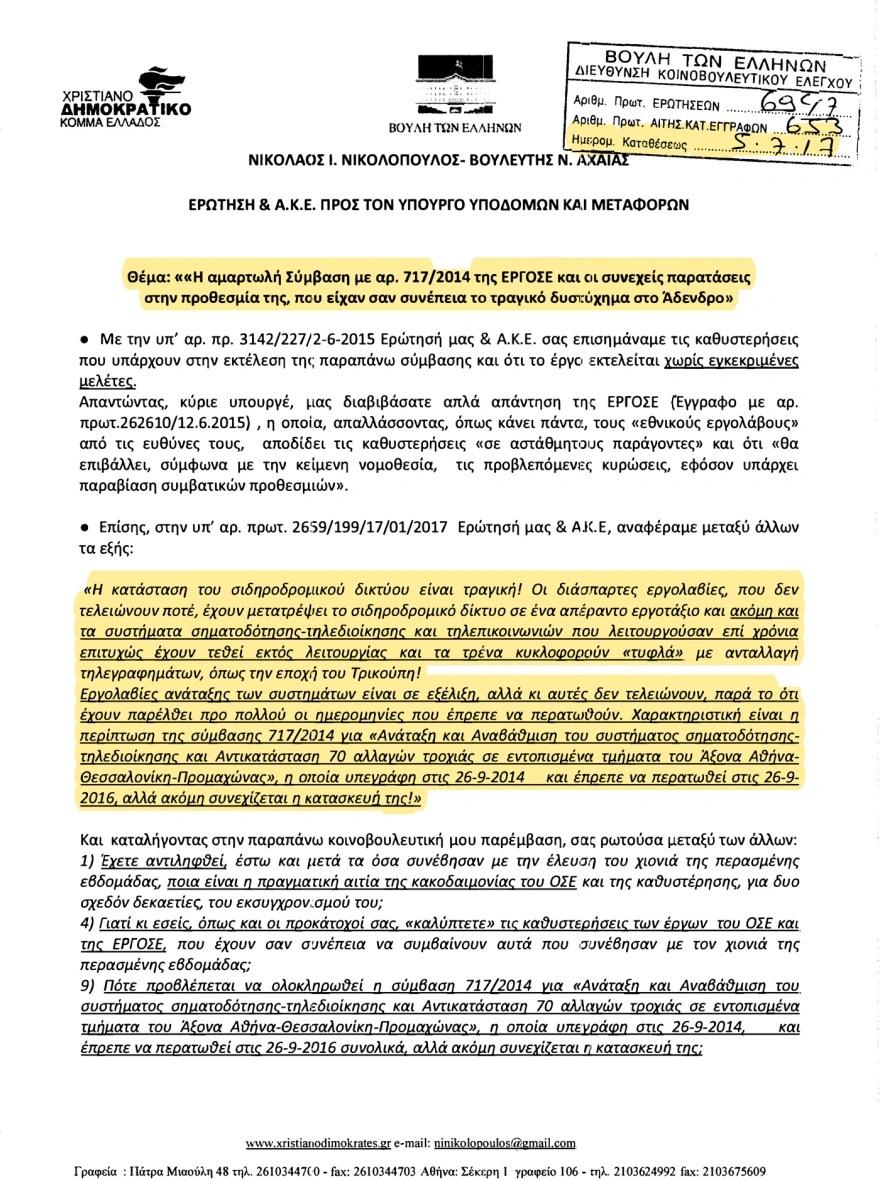 Η ερώτηση, που είχε γίνει μετά το δυστύχημα στο Άδενδρο, απευθυνόταν προς τον τότε υπουργό Υποδομών και Μεταφορών Χρήστο Σπίρτζη και είχε θέμα την αμαρτωλή σύμβαση 717/2014 (σ.σ. αυτή που συζητάμε και σήμερα για την τηλεδιοίκηση- ασφάλεια των τρένων) .