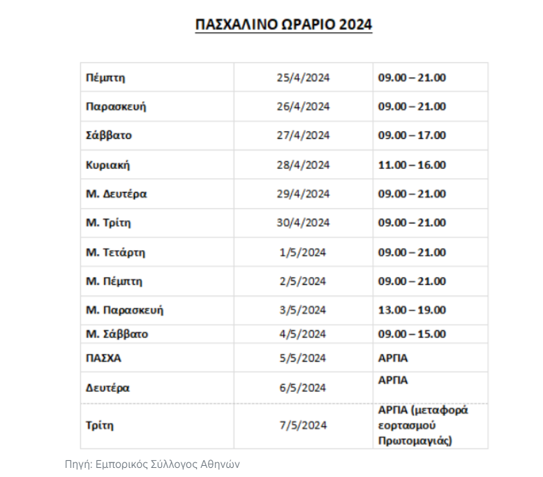 Την Κυριακή των Βαΐων στις 28 Απριλίου, τα καταστήματα θα ανοίξουν στις 11 το πρωί και θα μείνουν ανοιχτά έως τις 6 το απόγευμα. Ωστόσο από τη Μεγάλη Δευτέρα 29 Απριλίου έως τη Μεγάλη Πέμπτη 2 Μαΐου, τα εμπορικά καταστήματα θα λειτουργούν από τις 10 το πρωί έως τις 9 το βράδυ, ενώ τη Μεγάλη Παρασκευή θα ανοίξουν στη μία μετά το μεσημέρι και θα κλείσουν στις 7 το βράδυ. Το Μεγάλο Σάββατο θα λειτουργήσουν από τις 10 το πρωί έως τις 4 το μεσημέρι.