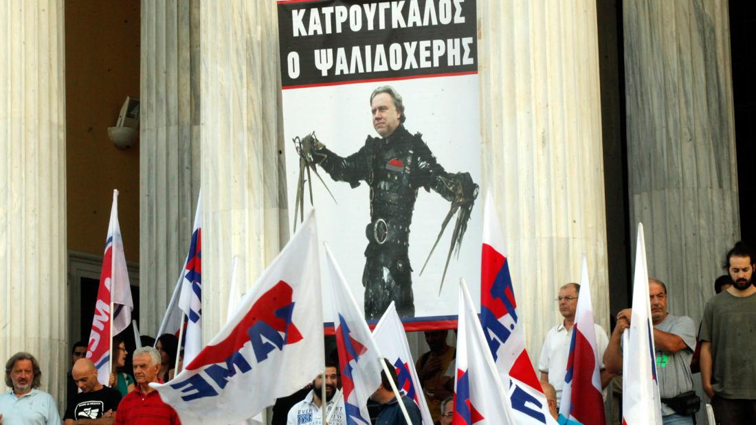 Ξεχώριζε το πανό που είχαν κρεμάσει όπου ο κ. Κατρούγκαλος εικονιζόταν ως ψαλιδοχέρης. Για τον υπουργό Εργασίας, μάλιστα, τα μέλη του ΠΑΜΕ φώναζαν το σύνθημα «Κατρούγκαλε, Κατρούγκαλε, με όλα αυτά που κάνει, τον Βρούτση τον ξεπέρασες, τον Λάσκαρη τον φτάνεις».