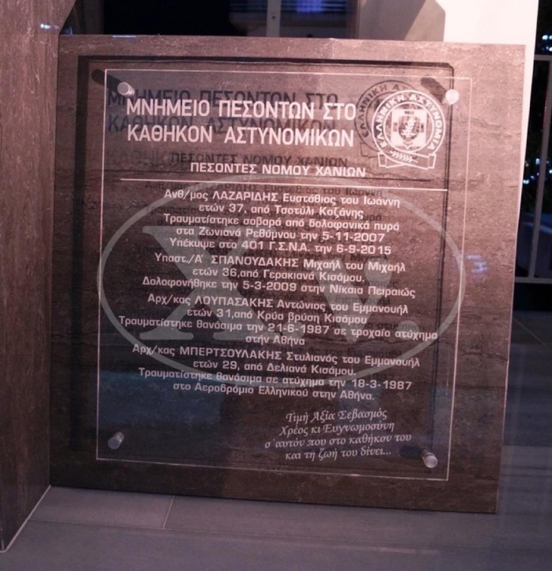 Η θυσία των Ελλήνων αστυνομικών όμως δεν μένει χωρίς αναγνώριση και σήμερα Σάββατο 01/04 έγιναν τα αποκαλυπτήρια μνημείου πεσόντων αστυνομικών, που βρίσκεται έξω από το Αστυνομικό Μέγαρο Χανίων και αναγέρθηκε με πρωτοβουλία της Ένωσης Αστυνομικών υπαλλήλων Χανίων.