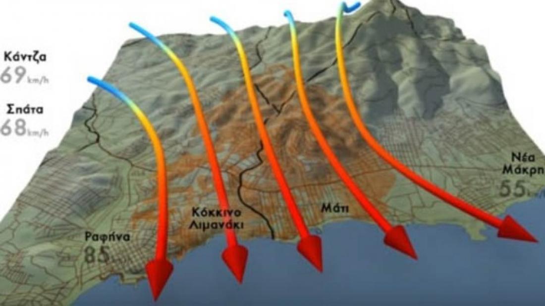 Επιπλέον όπως εξηγείται, στην Αν. Αττική οι θυελλώδεις άνεμοι έδρασαν ως καταβάτες από τις ορεινές εξάρσεις της περιοχής προς τη θάλασσα. Οι καταβάτες άνεμοι θεωρούνται παγκοσμίως ως ο πιο επικίνδυνος παράγοντας για την εξάπλωση της δασικής πυρκαγιάς. Χαρακτηρίζονται από μεγάλη ταχύτητα κοντά στην επιφάνεια, οδηγώντας σε σημαντική αύξηση της θερμοκρασίας και ξήρανση της ατμόσφαιρας. Οι συνθήκες αυτές αποτελούν χαρακτηριστικό παράδειγμα καιρού που ευνοεί την εκδήλωση πυρκαγιών με ακραία συμπεριφορά