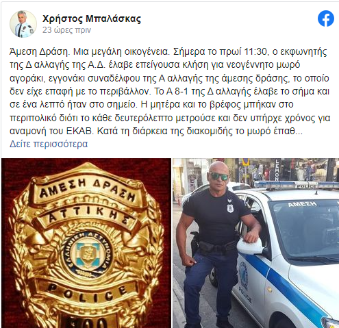 «Σε αυτή τη συγκλονιστική υπόθεση δεν βρίσκω τα κατάλληλα λόγια για να περιγράψω αυτά που πραγματικά αισθάνομαι. Ένα μεγάλο ευχαριστώ στον Γιώργο Δημόπουλο και τον Νίκο Φλέσσα, δύο άξια στελέχη της Ελληνικής Αστυνομίας, δύο σπουδαίους ανθρώπους. Έσωσαν ένα βρέφος 35 ημερών. Μετέφεραν το μωράκι μέσα σε 8 λεπτά από την Κοκκινιά στο Παίδων. Και του έκαναν ΚΑΡΠΑ μέσα στο περιπολικό γιατί η καρδούλα του είχε σταματήσει! Πολλά συγχαρητήρια επίσης στους άνδρες των ομάδων ΔΙΑΣ και ΖΗΤΑ για την καθοριστική συμβολή τους. Αυτό είναι το αληθινό πρόσωπο της Ελληνικής Αστυνομίας: ανθρωπιά, αλληλεγγύη, αποτελεσματικότητα. Σεβασμός, αγάπη και στήριξη στους αστυνομικούς μας που πολλές φορές υπερβαίνουν τον ίδιο τους τον εαυτό για τη ζωή των συνανθρώπων μας».