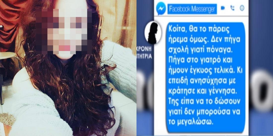 «Κοίτα θα το πάρεις ήρεμα όμως. Δεν πήγα σχολή γιατί πόναγα. Πήγα στον γιατρό και ήμουν έγκυος τελικά. Κι επειδή ανησύχησα με κράτησε και γέννησα. Της είπα να το δώσουν γιατί δεν θα μπορούσα να το μεγαλώσω. Η μάνα μου δεν ήξερε τίποτα. Πόσα εγκεφαλικά έπαθες; Μόνο εγώ τα κάνω αυτά μέσα σε μία μέρα. Είσαι η μόνη που το ξέρει. Ζεις; Έχω ακόμα λίγη αιμορραγία για αυτό δεν μπορώ να βγω σήμερα. Να βγούμε αύριο. Ξεφούσκωσα δεν μπορείς να πεις» γράφει η 22χρονη.