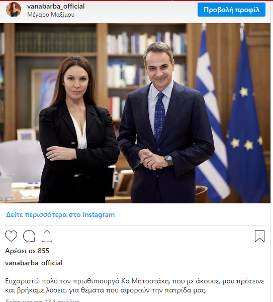 Η γνωστή ηθοποιός Βάνα Μπάρμπα συναντήθηκε με τον πρωθυπουργό Κυριάκο Μητσοτάκη στο Μέγαρο Μαξίμου με ανάρτησή της στο λογαριασμό της στο Instagram, έγραψε: