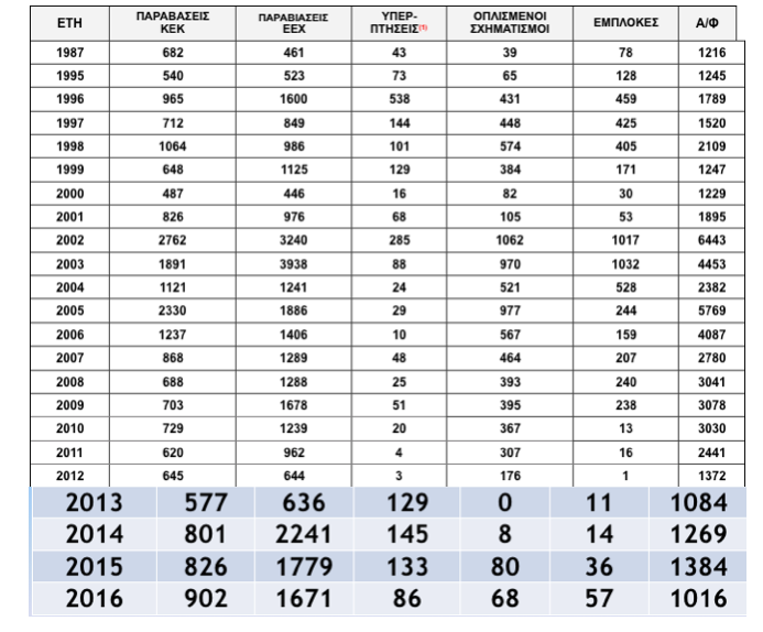 Πριν μερικές μέρες το ΓΕΑ έκανε μια ενημέρωση στους δημοσιογράφους του αμυντικού ρεπορτάζ για το επιχειρησιακό έργο της ΠΑ. Στα στοιχεία της ενημέρωσης,ένας πίνακας με αριθμητικά στοιχεία παραβιάσεων στο Αιγαίο και άλλων στατιστικών στοιχείων που περιλαμβάνουν το έτος 1987 -έτος της κρίσης του Μαρτίου- και τη χρονική περίοδο από το 1995 μέχρι και το 2016. Κάνοντας τη πρόσθεση τρομάζεις: