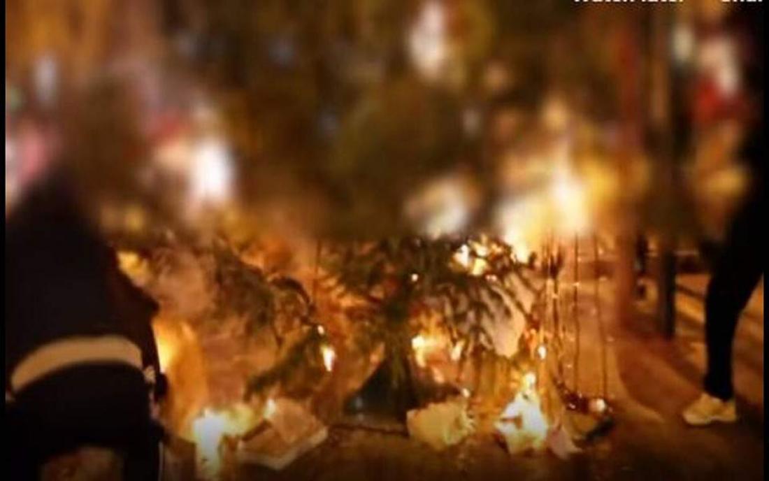 Σε βίντεο που αναρτήθηκε σε ιστοσελίδα του αντιεξουσιαστικού χώρου φαίνονται άγνωστοι να βάζουν φωτιά στο φυσικό έλατο, το οποίο έγινε τελικά στάχτη.