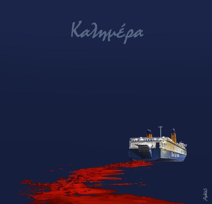 Συγκεκριμένα, το σκίτσο που ετοίμασε ο γνωστός σκιτσογράφος, δείχνει το πλοίο να απομακρύνεται από το λιμάνι και να έχει βάψει τη θάλασσα με το αίμα του 36χρονου Αντώνη.