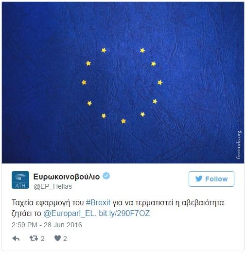 Ο επίσημος λογαριασμός του Γραφείου του Ευρωπαϊκού Κοινοβουλίου στην Ελλάδα "ανέβασε" φωτογραφία η οποία παρουσιάζει τη σημαία της ΕΕ με ένα αστέρι λιγότερο,ήτοι, χωρίς τη Βρετανία. Το σχετικό tweet αναφέρεται στο αίτημα του Ευρωπαϊκού Κοινοβουλίου για ταχεία εφαρμογή του Brexit, ώστε να τερματιστεί η αβεβαιότητα στην Ε.Ε. και περιγράφει με εύγλωττο τρόπο το κλίμα που επικρατεί στο Ευρωκοινοβούλιο έναντι της Βρετανίας.