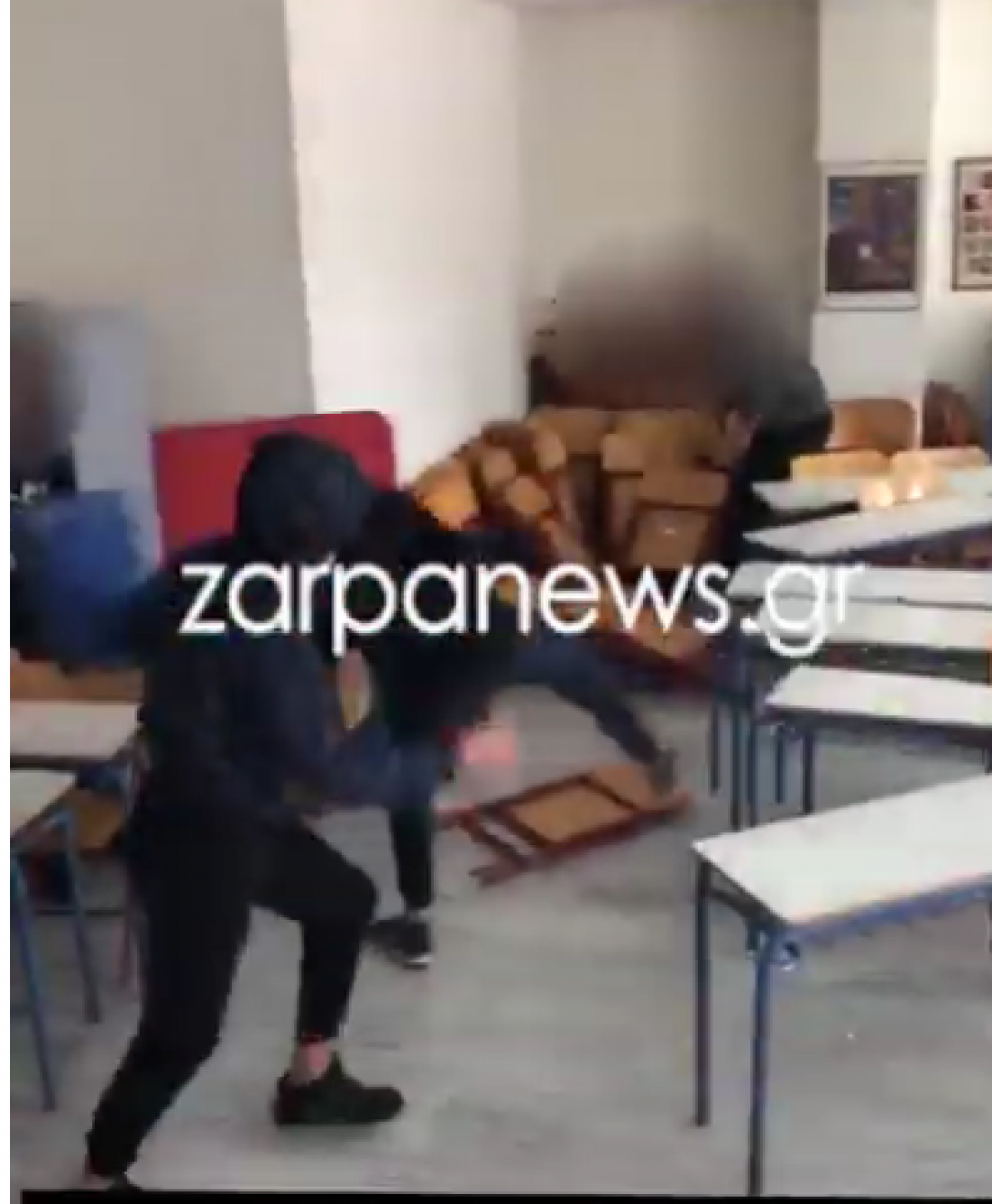 Οι μαθητές φορώντας κουκούλες, κλοτσούν θρανία και εκσφενδονίζουν με μανία τις καρέκλες μέσα σε μια τάξη