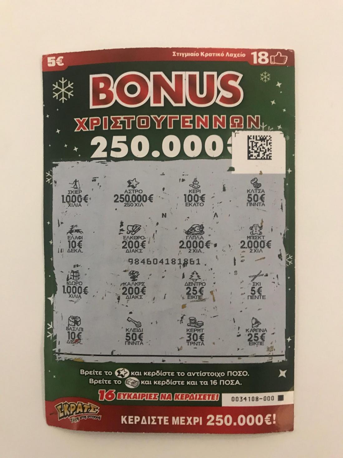 Χριστουγεννιάτικος λαχνός ΣΚΡΑΤΣ χάρισε 250.000 ευρώ σε έναν υπερτυχερό από την Κρήτη