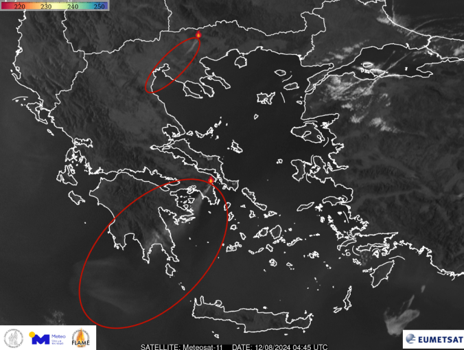 Σημειώνεται ότι το meteo κατέγραψε τη διασπορά του καπνού από τη μεγάλη πυρκαγιά που ξεκίνησε στη βορειοανατολική Αττική. Η μεγάλη διασπορά του καπνού της δασικής πυρκαγιάς που βρίσκεται σε εξέλιξη αποτυπώνεται στη δορυφορική εικόνα από τον Ευρωπαϊκό μετεωρολογικό δορυφόρο METEOSAT-11, που επεξεργάστηκε το Αστεροσκοπείο. Η απόσταση στην οποία έχει μεταφερθεί νοτιοδυτικά ο καπνός εκτιμάται σε περισσότερα από 300 χιλιόμετρα . Στη δορυφορική εικόνα είναι επίσης εμφανής και η διασπορά του καπνού από τη δασική πυρκαγιά στο Μενοίκιον Όρος του νομού Σερρών.